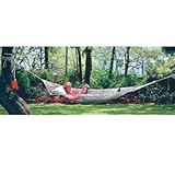 Made for two or more with a bed a full 10 inches wider than that of the Large Rope Hammock, the King Size Rope Hammock from Pawleys Island is a continuous woven bed of 100% 3-ply cotton rope. One thousand feet of rope used in hammock construction for durable woven bed with double-latch construction and 14 loops in body adding more rope for greater comfort and strength. Hand-tied bowline knot tightens with use. Hammock clew is macraméd for artistic design. Three-ply twisted rope reinforces bed strength while cotton rope fibers breathe for cool, comfortable lounging. Natural color of rope keeps hammock looking new. Spreader bars are constructed of solid oak for premium durability and strength. Spreader bars are triple dipped in marine spar varnish to lengthen life. Spreader design enhances gentle swaying motion. The King Size Cotton Rope Hammock easily provides support for up to 450 lbs. and comes complete with superior constructed hardware. Heavy-duty zinc chromate hardware resists rust. 3/16 proof coil chain affixes to two inch diameter ring for hanging versatility. Zinc plated hook and eyebolt assembly is the largest in the industry for added protection and to prevent stress on point of insertion.